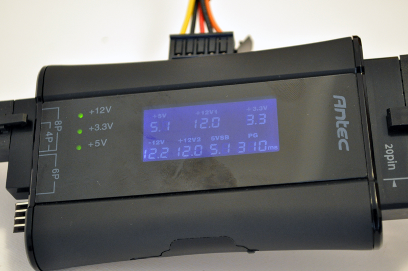 Il tester é riuscito a rilevare correttamente tutte le tensioni e i risultati riportati nel display sono in linea con quelli dichiarati dalle case produttrici. L'Antec risulta migliore e il display indica un fattore di Power Good pari a 310ms, contro i 330ms del Cooler Master. Entrambi riportano buoni valori sulle linee +3.3V, +5V e +12V. Ricordiamo che in idle i valori sono leggermente più alti rispetto alla situazione di full-load.
