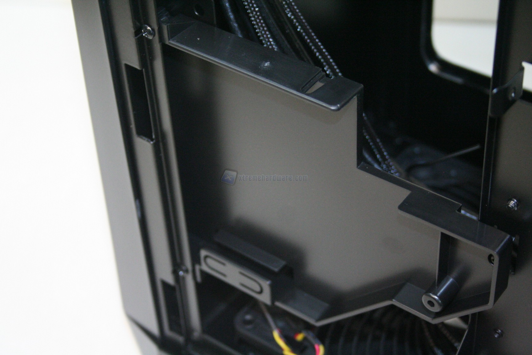 Il piatto della scheda madre è interamente in acciaio, anche se purtroppo lo spessore delle lamiere è inferiore ai modelli precedenti. Non che porti ad un problema strutturale, però siamo dell'idea che forse possa essere troppo leggero. Non è ovviamente removibile ma presenta numerosissime aperture posteriori, il che significa che sarà molto difficile che ci siano problemi relativi a compatibilità con sistemi di dissipazione o per il semplice passaggio dei cavi. Nella parte superiore è possibile installare un radiatore a liquido sullo stile del Silverstone TD03 Tundra. Per quanto riguarda la scheda video e la CPU troviamo un'ottima compatibilità, fino a 162mm in altezza, mentre per le VGA si arriva fino a 305mm. Diversamente dal Raven4, non troviamo sistemi di blocco delle VGA stile Server, oppure per la CPU, che nel caso precedente era posta in una configurazione sullo stile BTX, o ATX inverso (Lo standard BTX in realtà ha diverse altre caratteristiche, non presenti nel Raven4, sebbene la tipologia di dissipazione termica fosse molto simile).