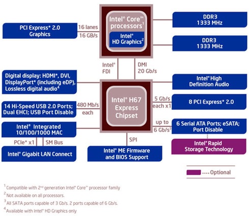 Entrambi i chipset P67 e H67 incarnano il concetto di Platform Controller HUB, ovvero elemento centrale della gestione dell'I/O, vista l'ormai totale integrazione delle funzioni del vecchio NorthBridge nella CPU e della scomparsa del SouthBridge.