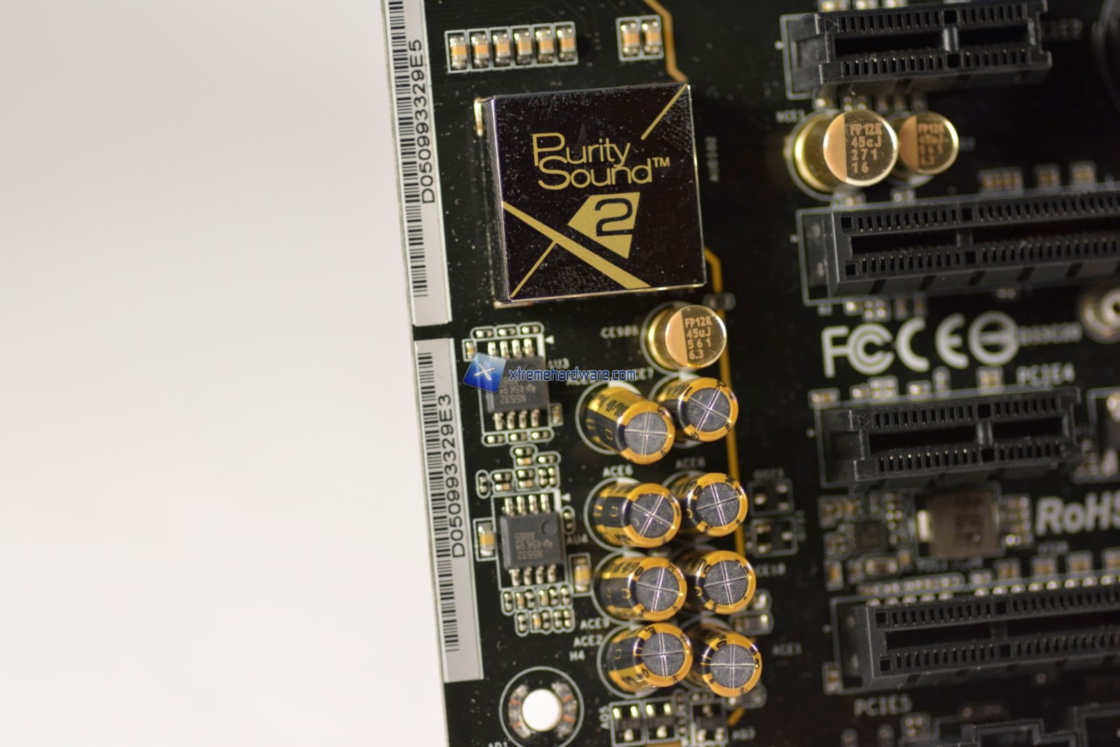 La qualità della sezione audio è ben curata e il sistema Purity Sound 2 è schermato dal resto del PCB per evitare eventuali interferenze. Sotto la schermatura si nasconde il processore Realtek ALC1150 che grazie alla presenza di condensatori giapponesi Nichicon espressamente progettati per impianti audio permettono di usufruire di un segnale più puro. Infine, per chi fa un utilizzo frequente delle cuffie, troviamo il chip della Texas Instruments TI NE5532 che ne amplifica il segnale senza aumentarne le distorsioni ad alte frequenze.